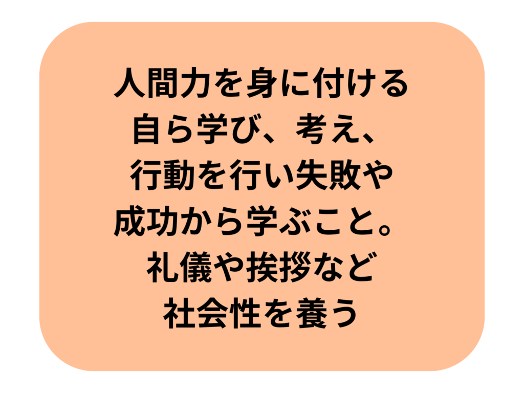仲間を大切にすることや、自分の意見を言う・相手の話を聞く事が出来るコミュニケーション能力を養います。サッカーを通してグループ行動を学びながら、社会性を身につく育成を行います。